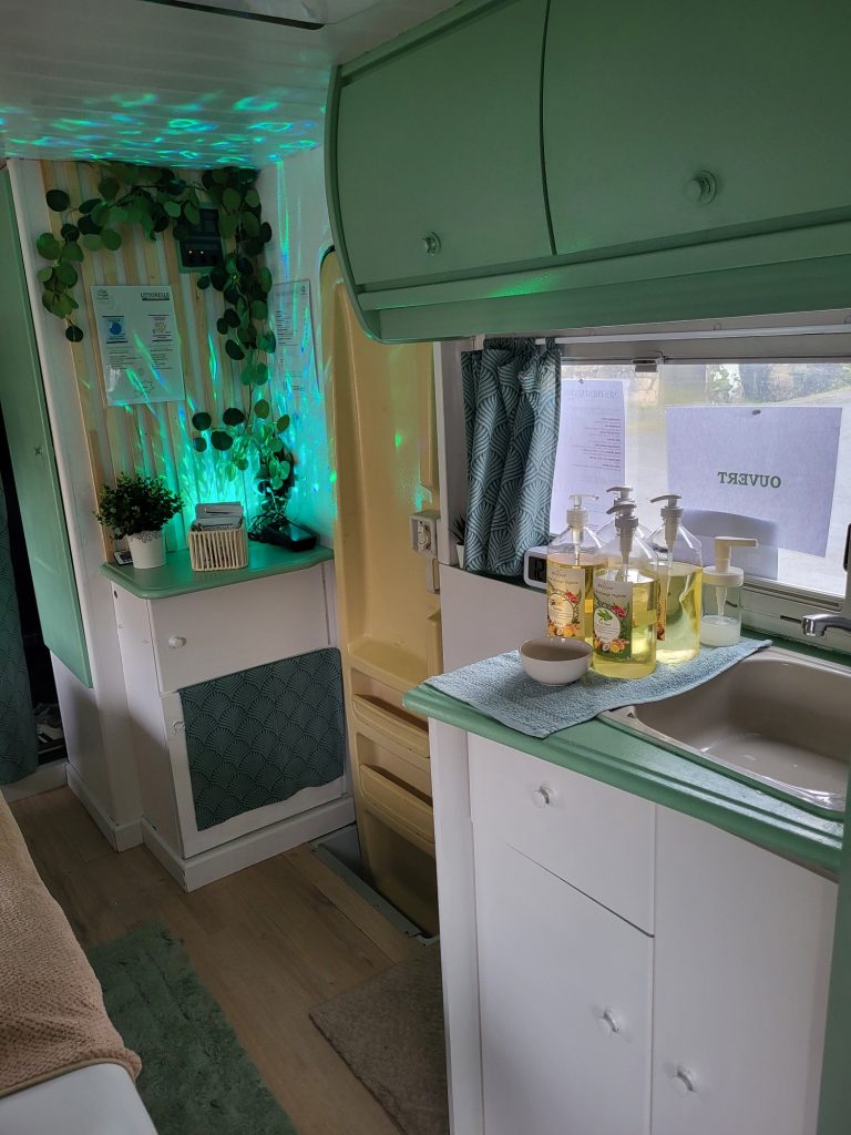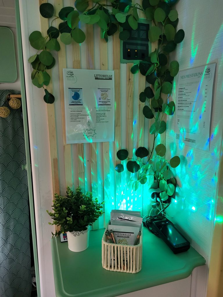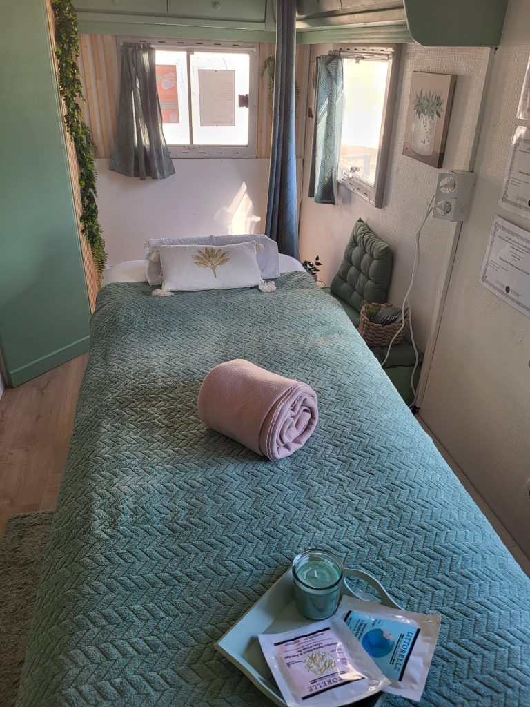 Il m'est facile de me déplacer avec ma maison sur le dos, mon beauty-truck de massages dispose de tout le confort pour vous permettre de vous relaxer le temps d'un massage.